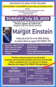 Join us as we celebrate Margot and support THE TERRIFIC TEN charities over a kosher dinner. Tickets must be purchased by Friday, July 14. Online $118 at cjui.org/donate, by check $100 made out to CJUI and mailed to CJUI, Box 515, New Town, MA 02456, table of 10 $1,500 includes sponsor listing. All donations will be shared equally with the ten charities by CJUI, a 501(c)3 organization.